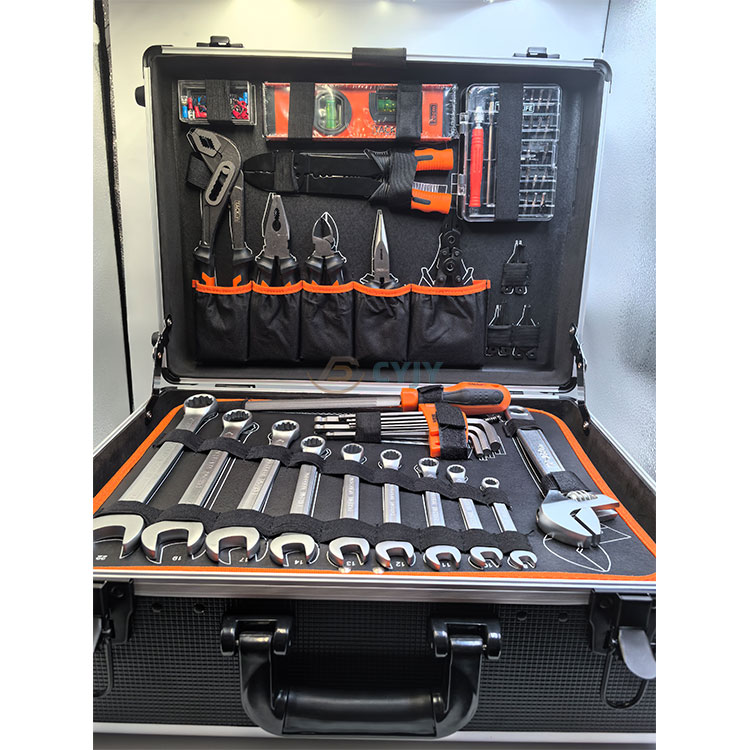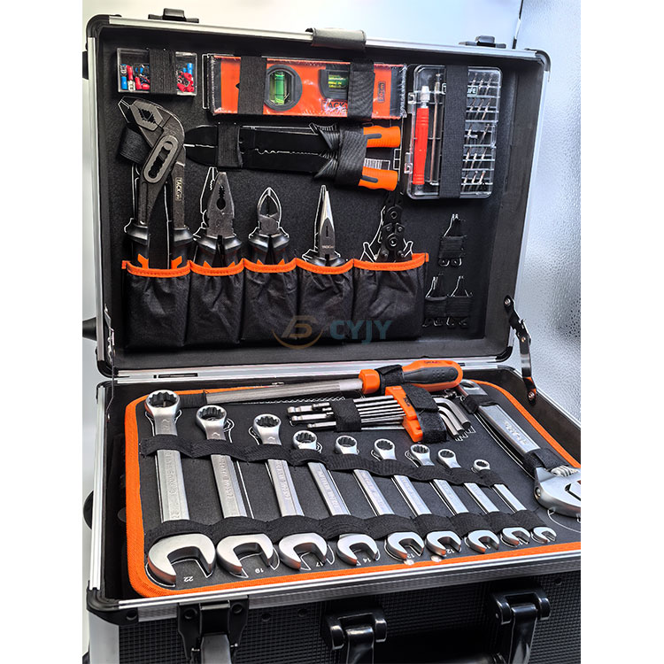 Комплетот за рачен алат од 177 парчиња е направен од CYJY. Кутијата за алат содржи 177 најчесто користени алатки. Кутијата за алат вклучува клучеви, шрафцигери, универзални спојници, мерни траки, приклучоци итн. Секој слој на алати е фиксиран и поставен уредно и уредно. Дизајнот на тампон обезбедува подобра заштита за вашите алатки.