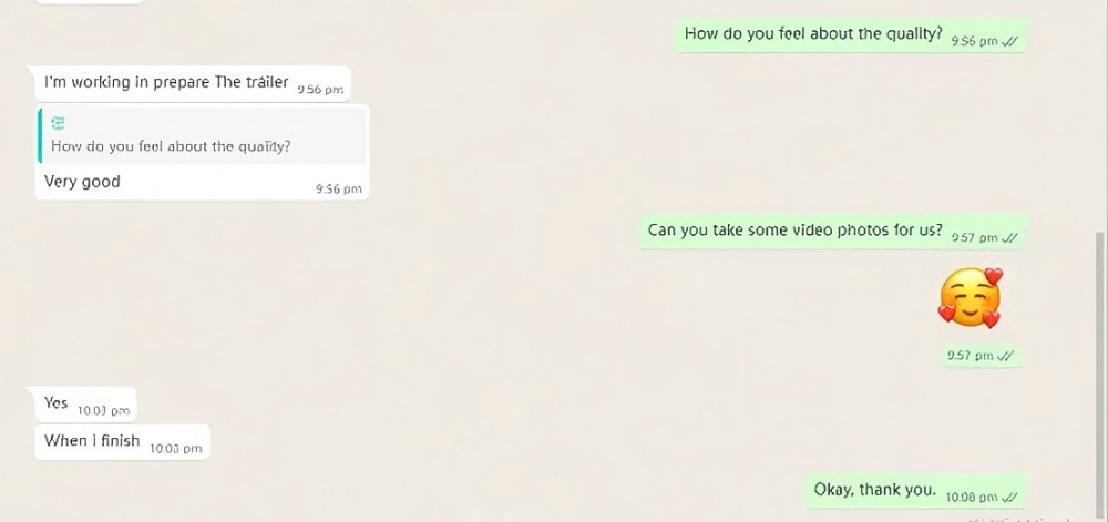 Нашиот персонал ќе фотографира на секој дел: табла за сечење, свиткување, заварување, сликање, склопување, пакување, вчитување, итн. Ние ќе ви ги испратиме најновите вести на секој дел со детални фотографии за да можете подобро да го разберете статусот на вашата нарачка.