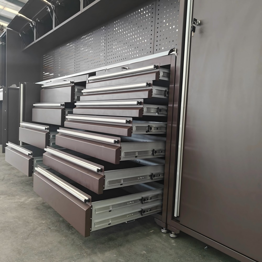 Мултифункционална интеграција: TheМултифункционален кабинет за алатки за комбинацијаима повеќе прегради во внатрешноста што можат флексибилно да се прилагодат за да се сместат алатки, опрема и датотеки со различни големини и форми според потребите на корисникот. Кабинетот за мултифункционални комбинирани алатки е опремен со професионални куки за алатки, фиоки и партиции за да се обезбеди дека алатките се уредно распоредени и лесни за пристап.