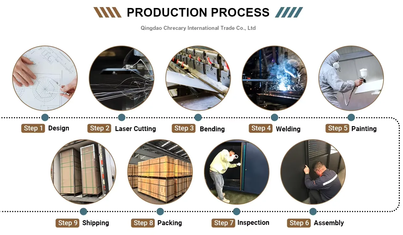 4. Формирање и склопување: Се користи машина за свиткување за прецизно свиткање на исечените челични плочи за да се формираат формите на компонентите како што се телото на кабинетот на алатките и фиоките. Различни компоненти се цврсто поврзани преку процесите на заварување, како што се заварување на самото место и заварување со лак за да се обезбеди стабилност на целокупната структура. Потоа, инсталирани се додатоци, како што се слајдови за лежишта, брави и тркачи за фиоки.